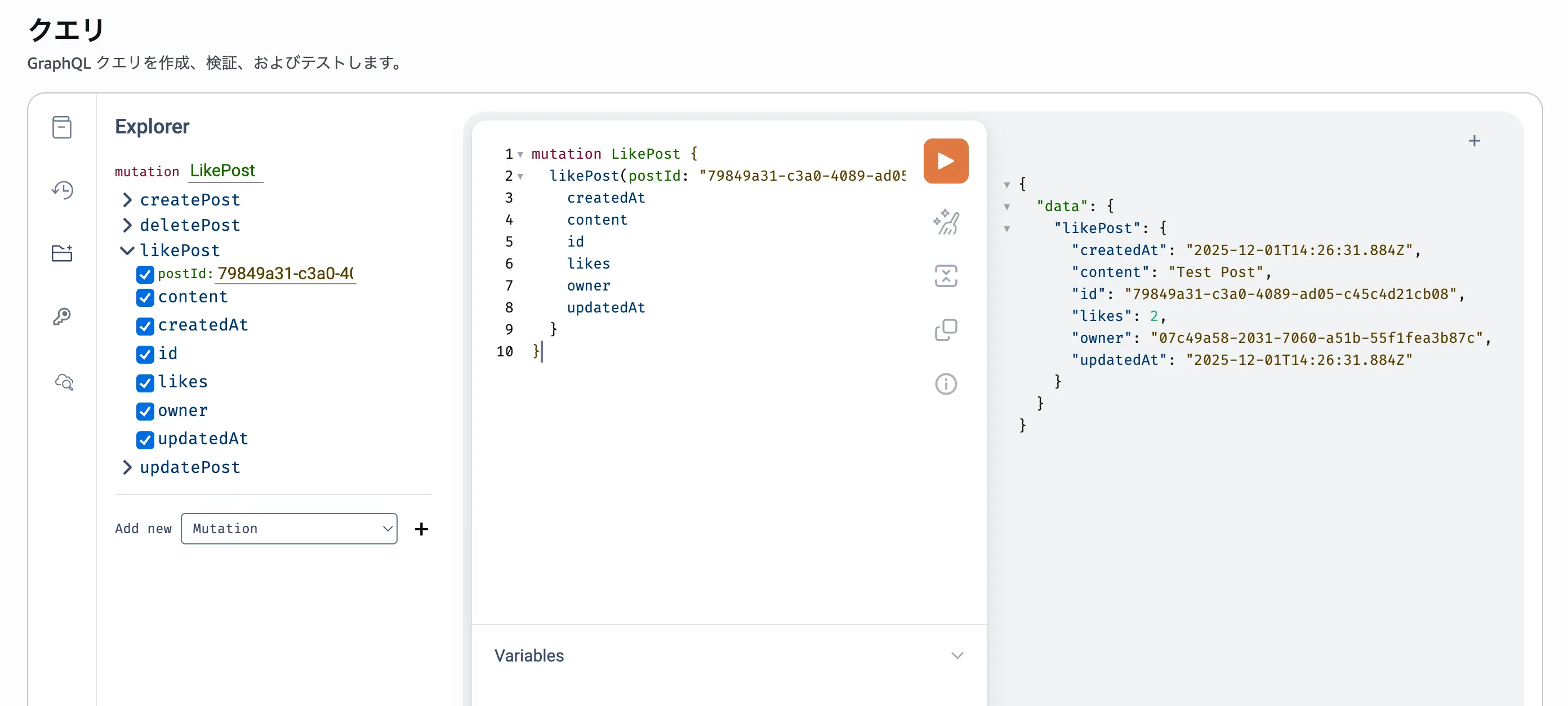 以下のコマンドで sandbox 環境にデプロイして、AppSync コンソールからlikePostミューテーションを実行できるはずです。