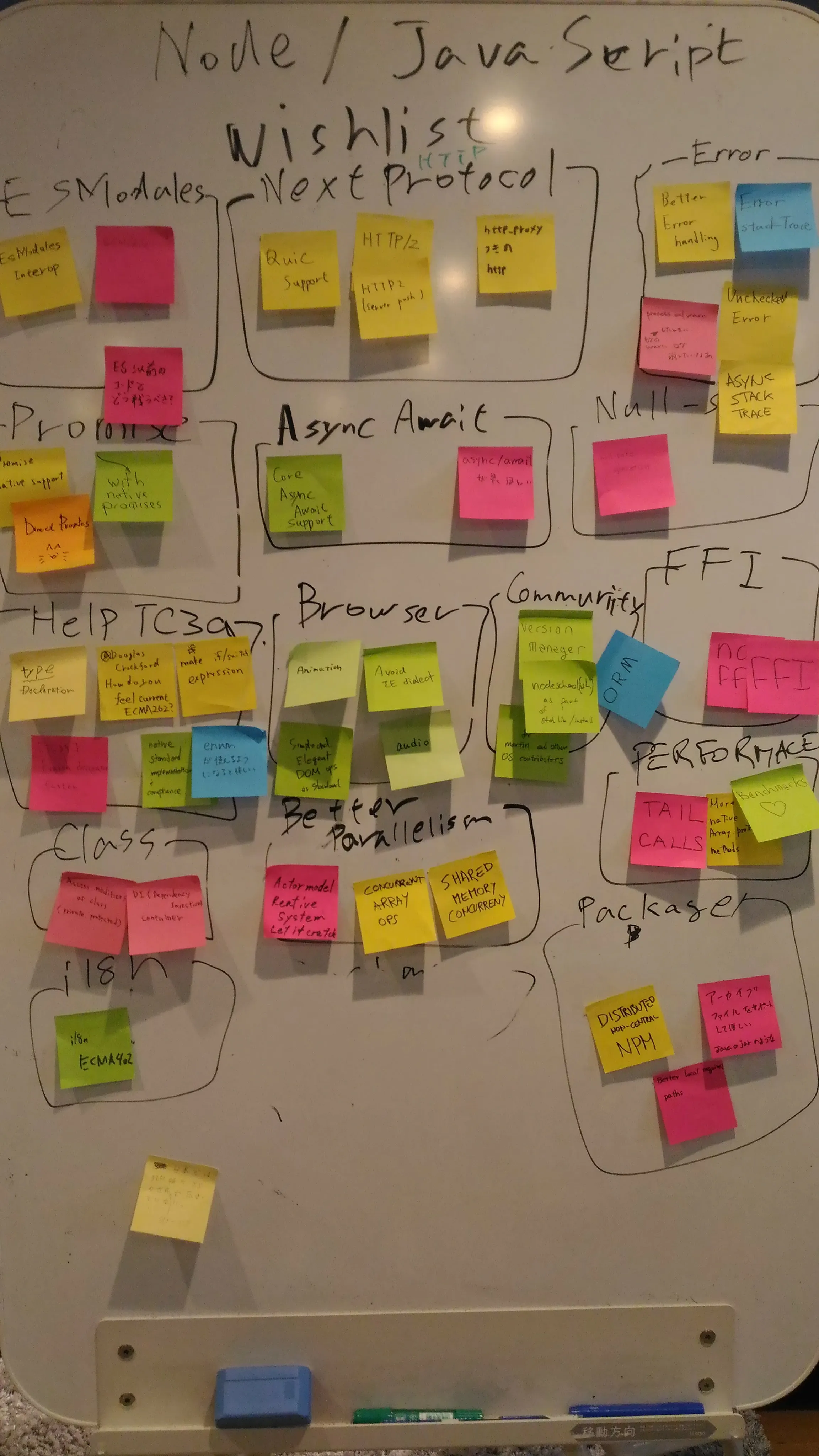 Node Discussion では Node.js(JavaScript)に関して Good Point, Bad Point, Wishlist の切り口で思うところを付箋に書いて議論しました。 適宜通訳してくれてたので英語が得意でない自分としてはありがたかったです。 後日、Twitter を見ていると Wishlist に対する回答が @bmeck の回答 から出ていました。当日付箋に書かれた内容一つ一つにちゃんと回答してくれていて本当にありがたいなと思います。私も Node.js でアーカイブファイルがあるといいなということを書いたのですが、それに対しても回答があり、node-loaderというモジュール(知らなかった)や Node.js でのやり取りに issue へのリンクもあってとても参考になりました。