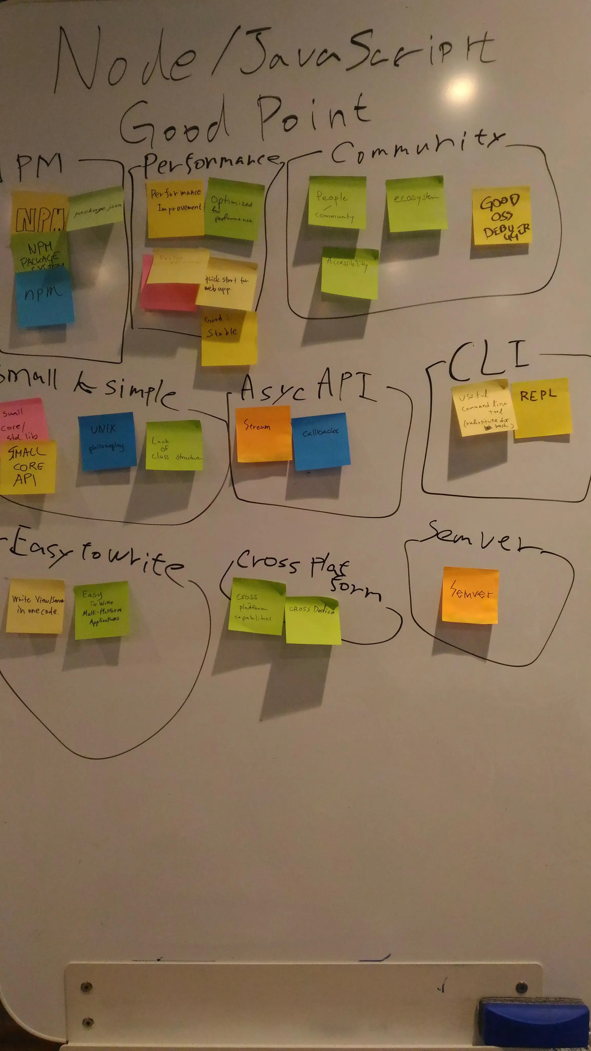 Node Discussion では Node.js(JavaScript)に関して Good Point, Bad Point, Wishlist の切り口で思うところを付箋に書いて議論しました。 適宜通訳してくれてたので英語が得意でない自分としてはありがたかったです。 後日、Twitter を見ていると Wishlist に対する回答が @bmeck の回答 から出ていました。当日付箋に書かれた内容一つ一つにちゃんと回答してくれていて本当にありがたいなと思います。私も Node.js でアーカイブファイルがあるといいなということを書いたのですが、それに対しても回答があり、node-loaderというモジュール(知らなかった)や Node.js でのやり取りに issue へのリンクもあってとても参考になりました。